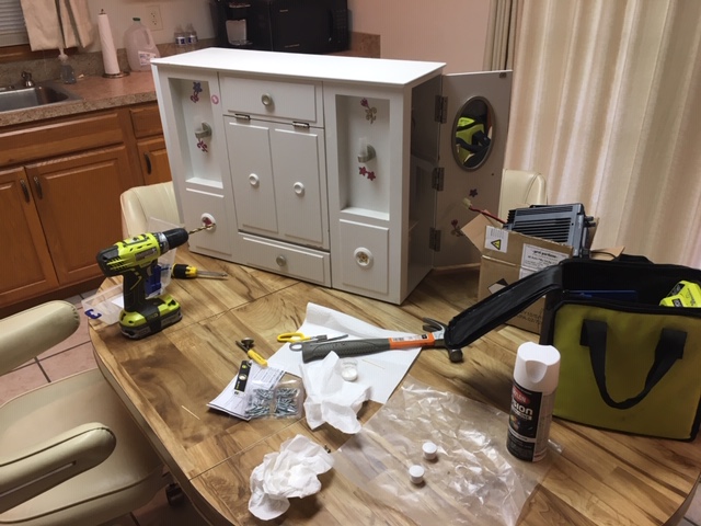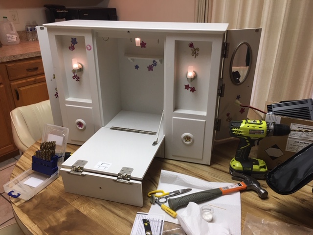 Here is the play house I worked on the beginning of the week. One of the handles was missing so we went to Hobby Lobby and got some wood handles, painted them white and put them on the side doors so the knobs in front would all look the same. The bracket that holds the front door from going all the way down was all bent and the fixture inside the frame was pulled out so I had to straighten that and put the fixture back on the inside for it to work. The lights didn’t work and I traced that down to a dirty switch on the front that turned off the lights when you closed the front door. So all is good and Shelby is very happy.
