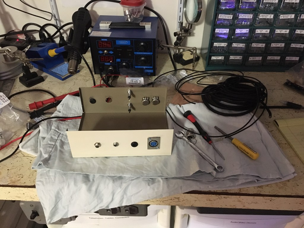 This is a picture of the progress on Gary’s audio interface project. Spent a lot of time on it this week. With any luck I will have it done next week. Since I didn’t feel well I did not go to the weekly get together last Sunday so I spent the day in the Morton building on the drill press getting the holes cut for the jacks, controls and indicators. Did some detail work a couple evenings this week and spent most of Friday mounting some of the hardware. Next step will be wiring it all together. Hopefully will have a picture of that next week.