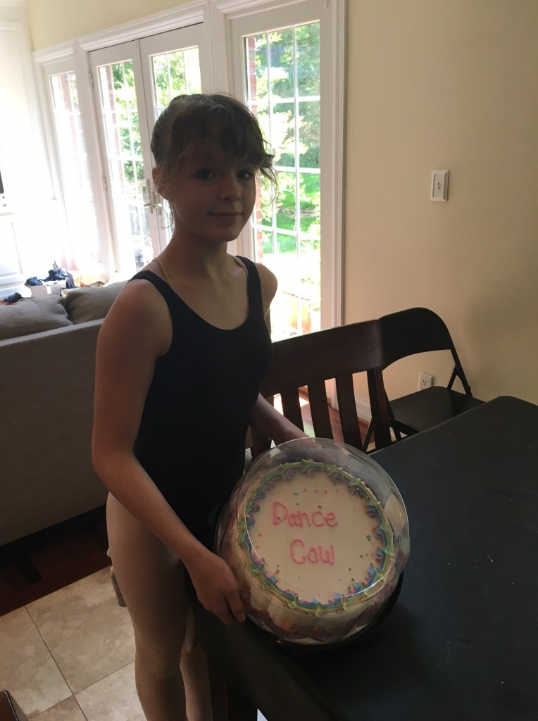 On the way home her mother wanted to get her an ice cream cake from Dairy Queen to celebrate the event. We tried several things to write on the cake like “Dancing Queen”, “Dancing Princess”, “Ballet Star”, and many others. But Chloe said she wanted “Dance Cow”. She was very surprised when we went through the drive at Dairy Queen and her mother asked for “Dance Cow”.