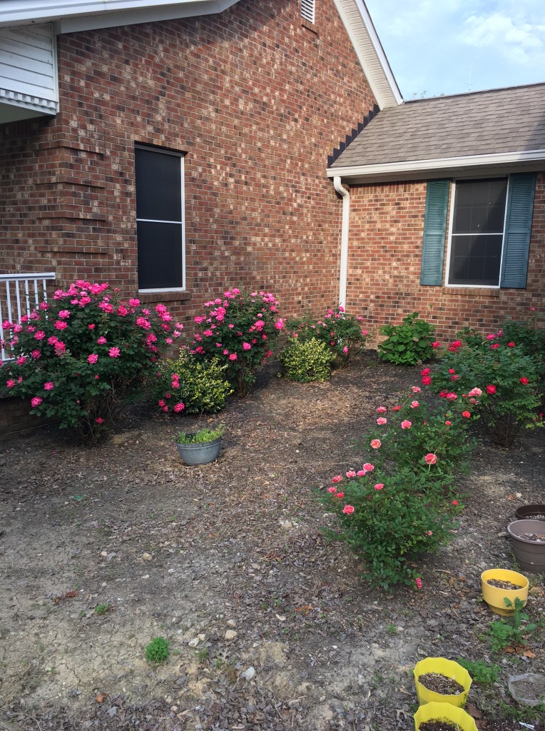 Kathy’s roses are in full bloom. We really need to put some mulch in here but we have too many other projects in the works right now.
