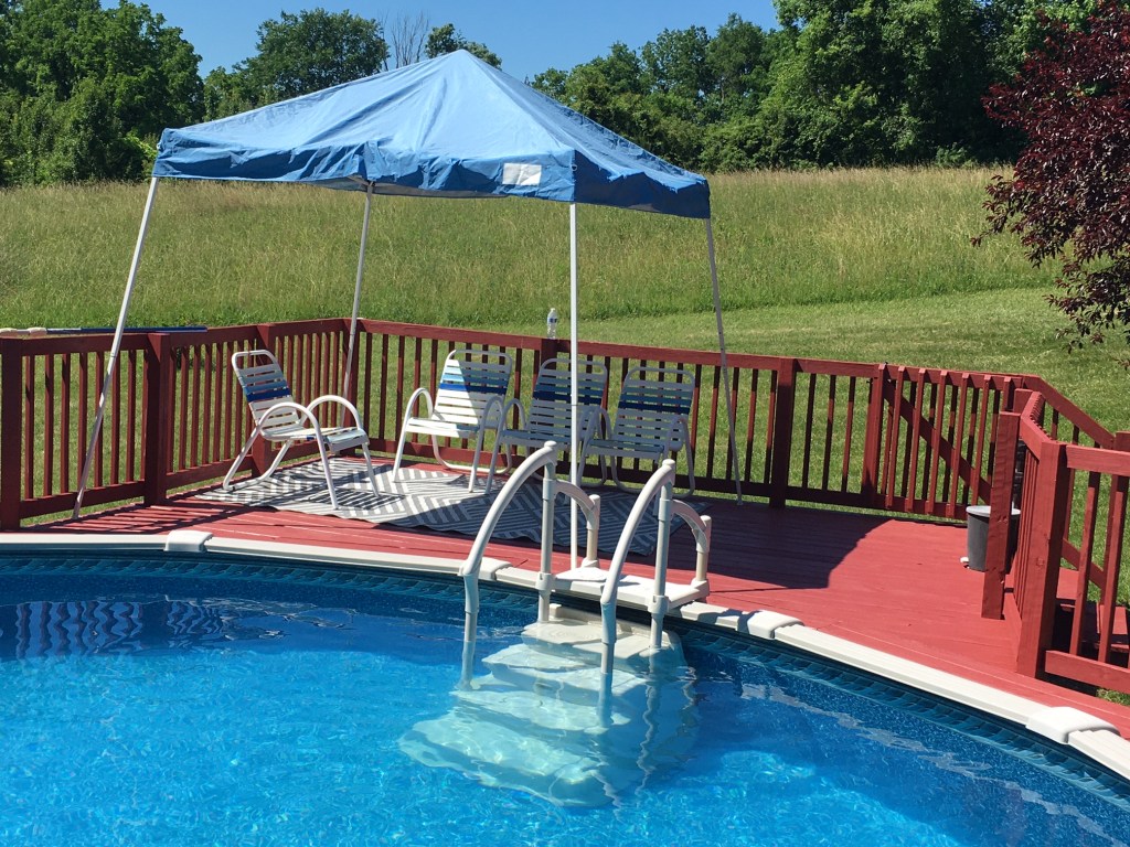 This week we got aggressive at getting the pool open. They finished the staining last week so Monday evening we pressure washed the ladder and furniture and put it in the shop to dry. Kathy had to take Chloe to an appointment on Tuesday morning so I got busy with getting the pool open. I vacuumed the last little bit of stuff out of the bottom then got the stuff moved over from the shop.