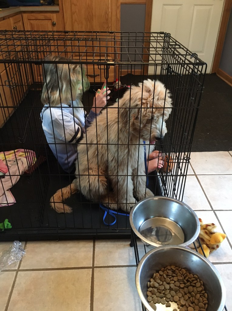 For some reason Shelby wanted to escape things so she crawled in the cage with Rusty. Not sure what that was all about but it made for a good picture.