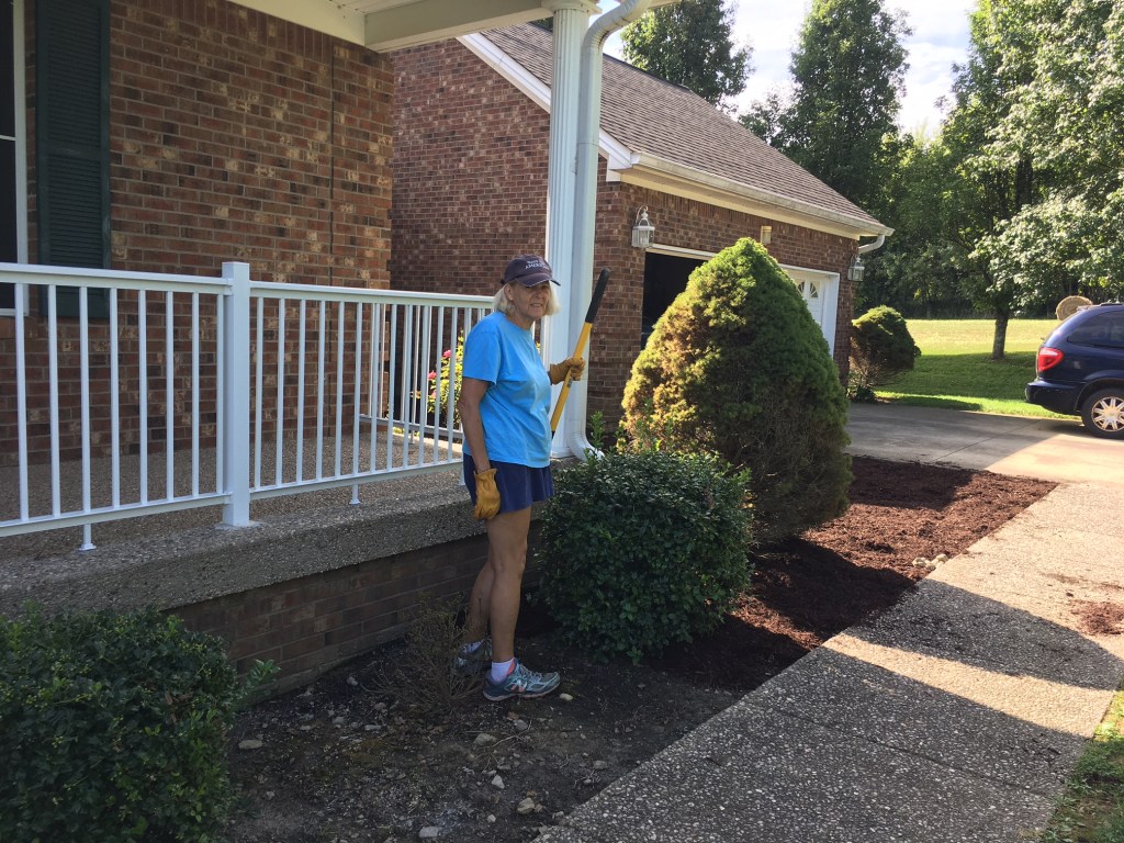 Here’s Kathy, rake in hand working the mulch.