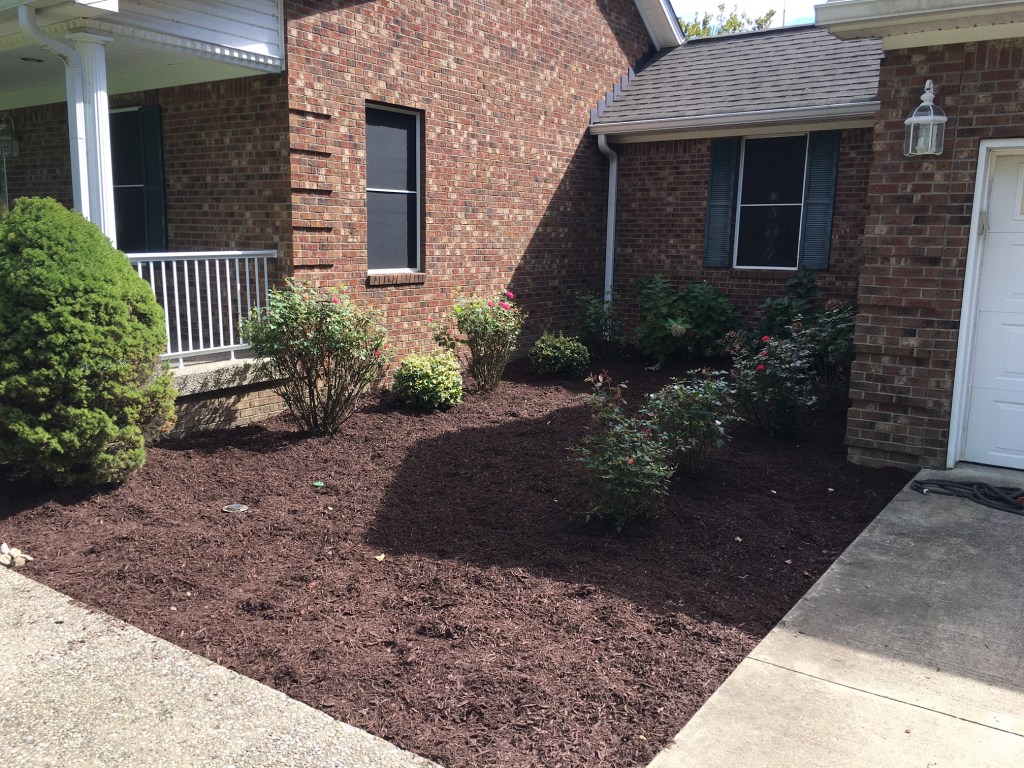 On the mulch issue, we made a total of 4 trips to the landscaping place near our house. Picked up two scoops of mulch on each trip. According to various websites, a scoop of mulch is about 1/2 cubic yard and weighs around 400 to 500 pounds. So I’ll let you do the math.