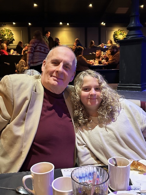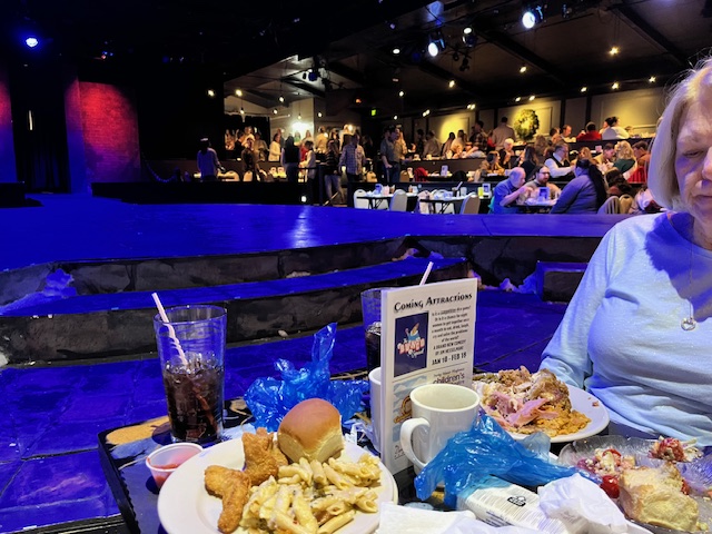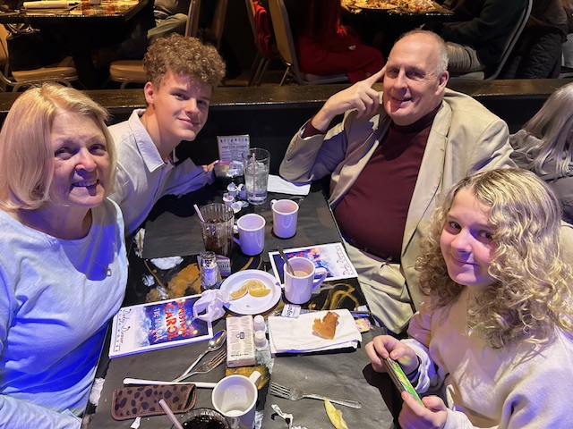 Yes, like I said, the son-in-law treated us to the Derby City Dinner Theater Friday night. Their whole family was going so Kathy and I drove up to Indiana in the truck and met up with them there. The tables only seat 4 so Mike, Julie and Chloe sat at one table. Kathy, Shelby, Carter and I sat at another. We were about 6 feet from the stage. The show was the musical “A Christmas Carol”. And it was great. Here are some pictures we took.
